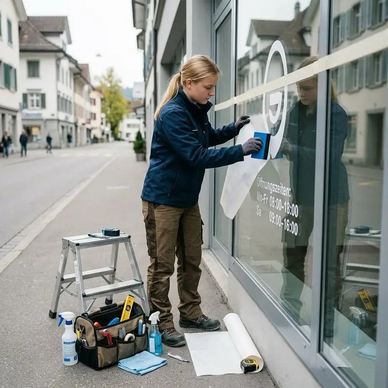 "description": "Du klebst und montierst das fertige Schild oder die Folienbeschriftung an einer Glasfront oder Fassade vor Ort.",