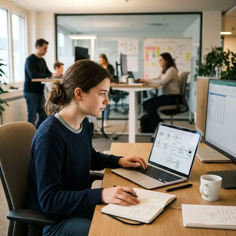 "description": "Du zeichnest an deinem Laptop im Büro ein Prozessdiagramm, das einen digitalen Geschäftsablauf Schritt für Schritt ordnet.",