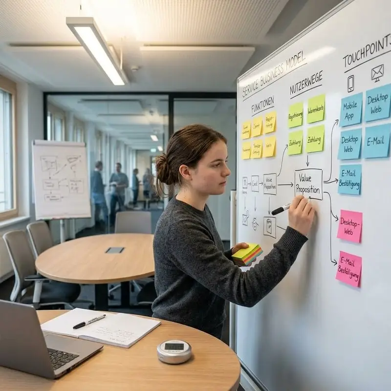 "description": "Du skizzierst am Whiteboard im Projektraum ein neues digitales Geschäftsmodell und ergänzt es mit Post-its zu Funktionen und Nutzerwegen.",