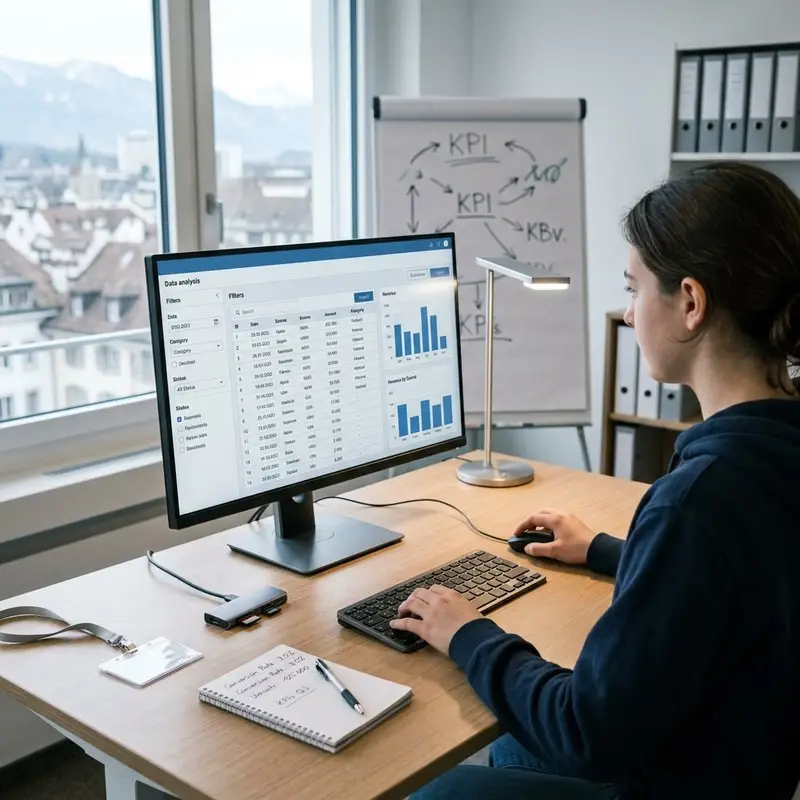 "description": "Du importierst am Computer Datensätze in ein Analyse-Tool und filterst sie, um relevante Kennzahlen sichtbar zu machen.",