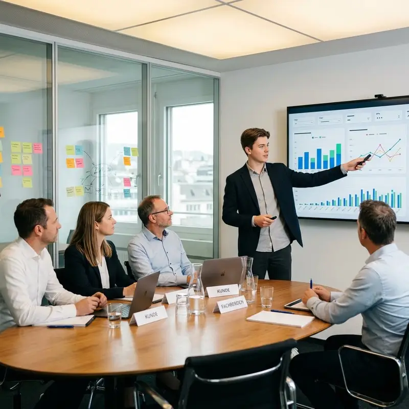 "description": "Du präsentierst in einem Meetingraum ein Dashboard auf dem Bildschirm und erklärst die Diagramme den Fachleuten und Kunden.",
