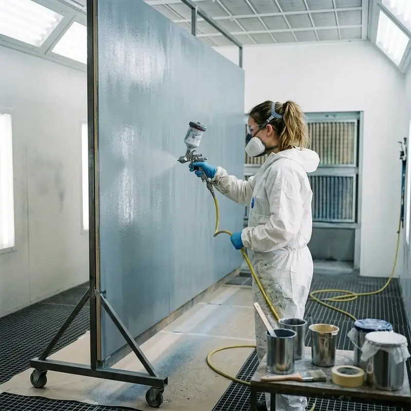 "description": "Du spritzt mit der Spritzpistole Farbe auf eine grosse Kulissenwand in der Spritzkabine, um die Fläche gleichmässig zu decken.",