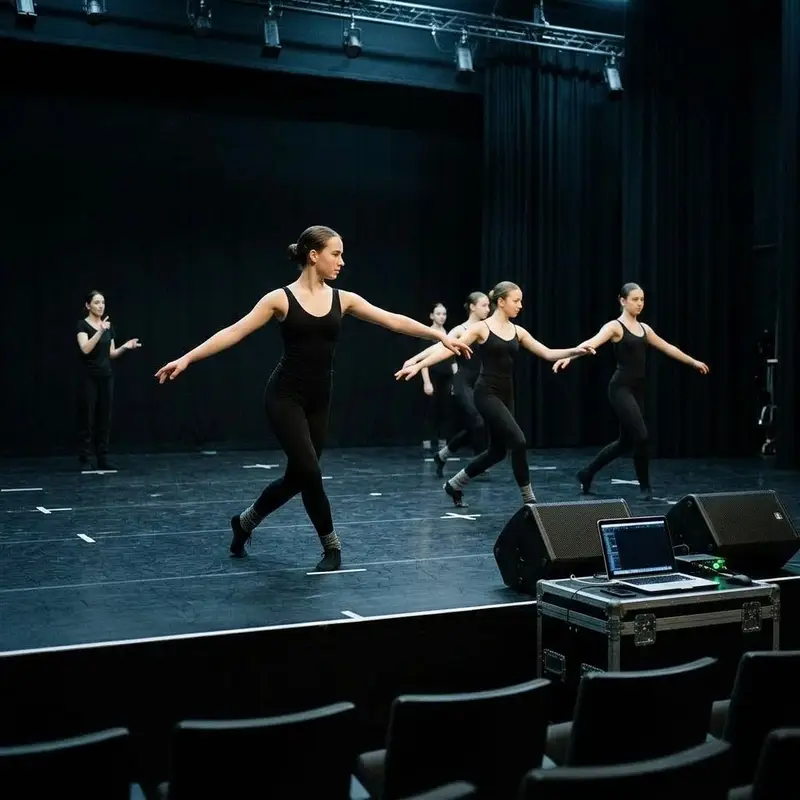 "description": "Du probst mit anderen Tänzerinnen auf der Bühne die Formationen, während Musik aus den Lautsprechern läuft.",
