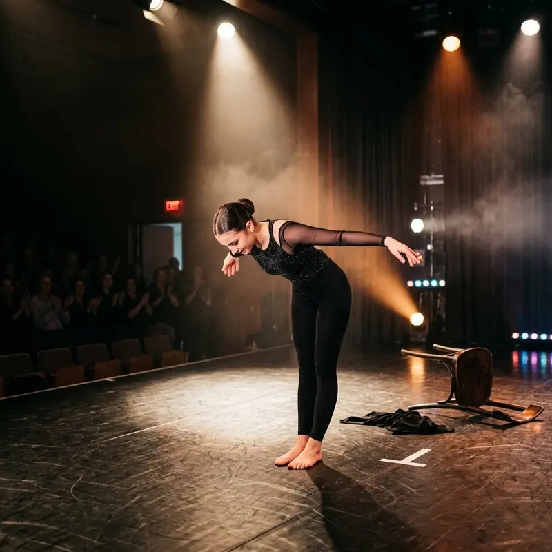 "description": "Du tanzt unter Scheinwerfern auf der Bühne eine Show und verbeugst dich am Ende vor dem Publikum.",