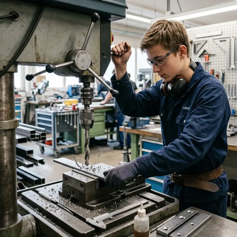 "description": "Du bohrst mit der Ständerbohrmaschine präzise Löcher in Metallteile für Schrauben und Nieten.",