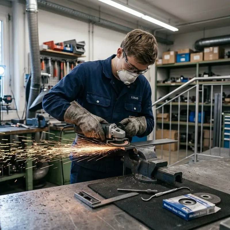 "description": "Du schleifst Metallkanten mit dem Winkelschleifer ab, bis die Oberfläche glatt und gratfrei ist.",