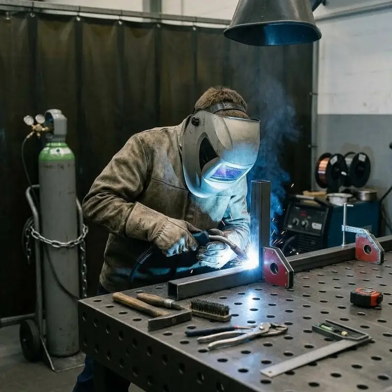 "description": "Du richtest Bauteile auf dem Schweisstisch aus und verschweisst sie mit dem Schweissgerät zu einer stabilen Konstruktion.",
