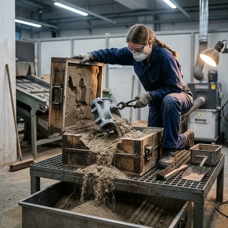 "description": "Du öffnest die Sandform und hebst das abgekühlte Gussteil mit Haken oder Zange aus dem Formkasten.",