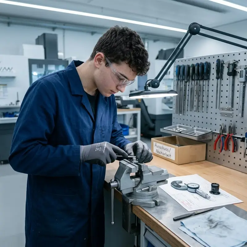 "description": "Du spannst ein fehlerhaftes Teil erneut ein und bearbeitest es mit Feile oder Schleifstein nach, bis es die Toleranzen einhält.",