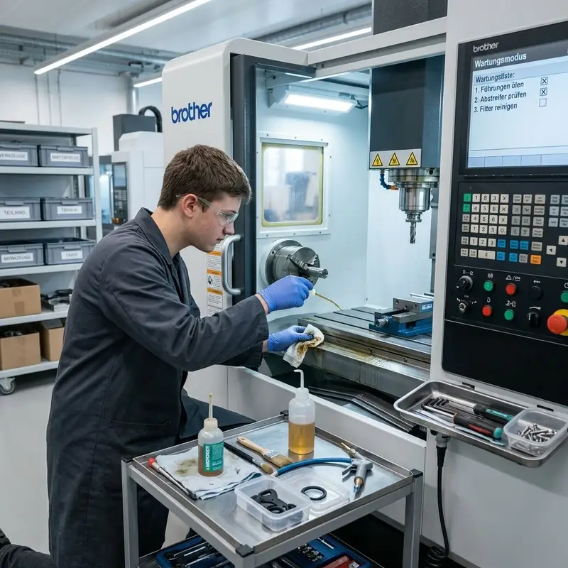 "description": "Du reinigst und ölst die Maschine, wechselst Verschleissteile und prüfst die Funktion im Werkstattbereich.",