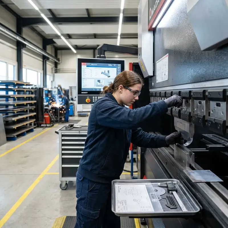 "description": "Du richtest in der Fabrikhalle eine Abkantpresse oder CNC-Maschine ein und spannst das Werkzeug für den nächsten Arbeitsgang ein.",