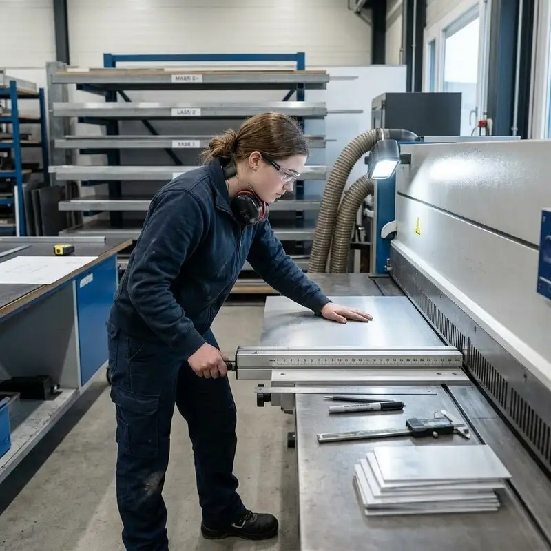 "description": "Du schneidest Metall- oder Kunststoffplatten mit der Tafelschere oder Bandsäge auf die vorgegebenen Masse zu.",
