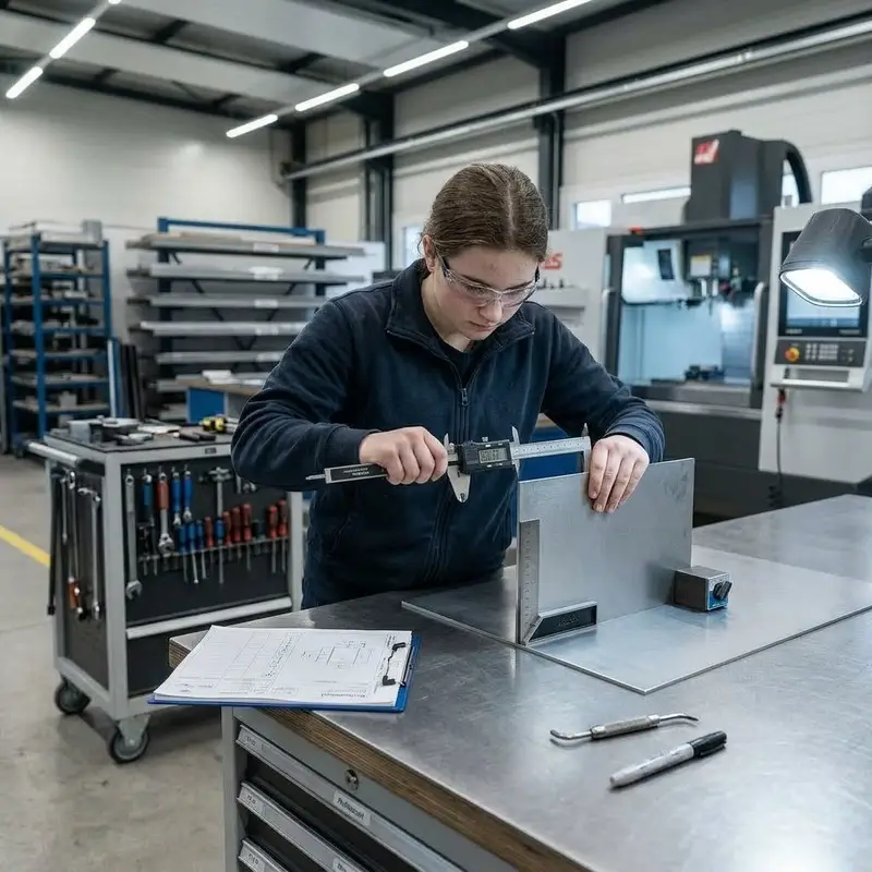 "description": "Du misst die zugeschnittenen Teile mit Messschieber und Winkel auf Masshaltigkeit, bevor du sie weiterverarbeitest.",