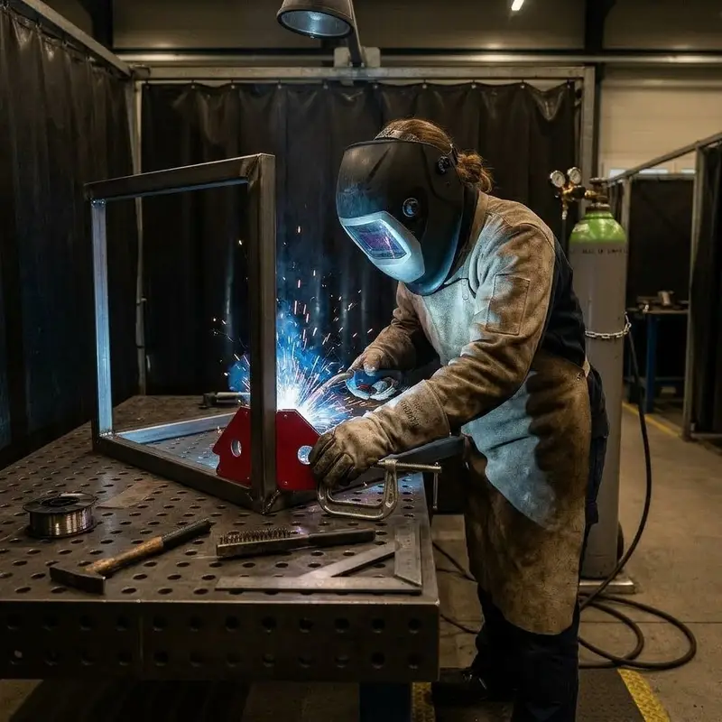 "description": "Du heftest und schweissst Bauteile mit dem Schweissgerät auf der Werkbank zu einem stabilen Rahmen zusammen.",