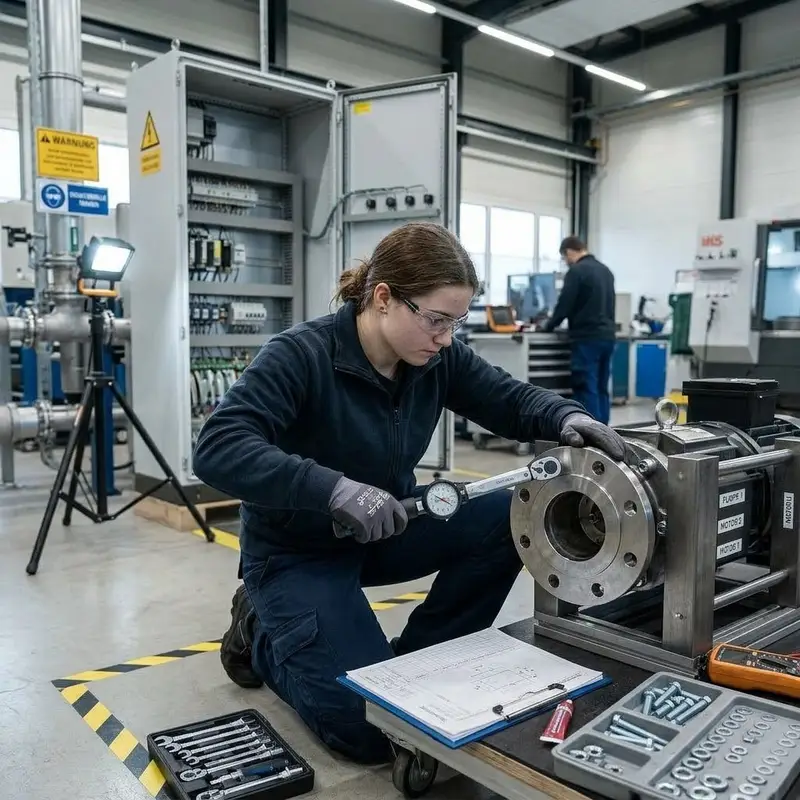 "description": "Du montierst die fertigen Baugruppen mit Schraubenschlüssel und Drehmomentschlüssel zu einer kompletten Anlage und prüfst die Funktion am Einsatzort.",