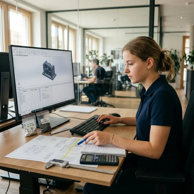 "description": "Du berechnest am Computer die benötigten Materialmengen und wählst passende Werkstoffe für ein Bauteil im Konstruktionsbüro aus.",