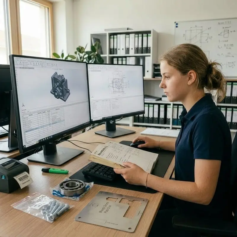 "description": "Du erstellst aus dem CAD-Modell eine Stückliste und legst Schrauben, Lager und Blechteile für die Produktion fest.",