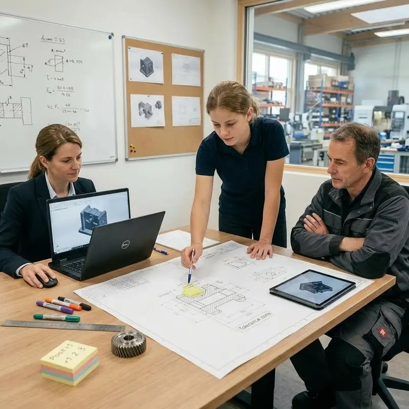 "description": "Du besprichst deine Konstruktionspläne mit Ingenieurinnen und Werkstattfachleuten am Besprechungstisch und passt die Zeichnung danach an.",