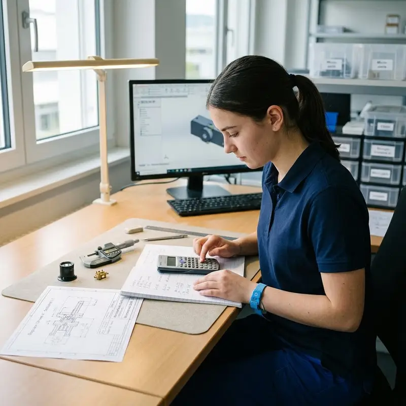 "description": "Du berechnest mit Taschenrechner und Notizblock die genauen Abmessungen eines winzigen Bauteils am Zeichentisch.",