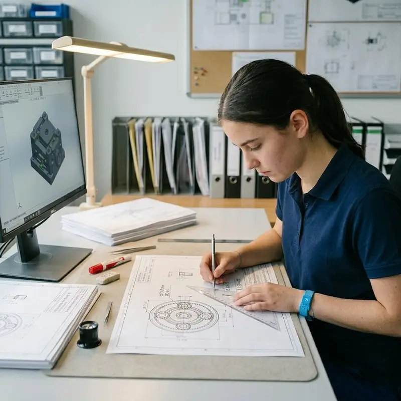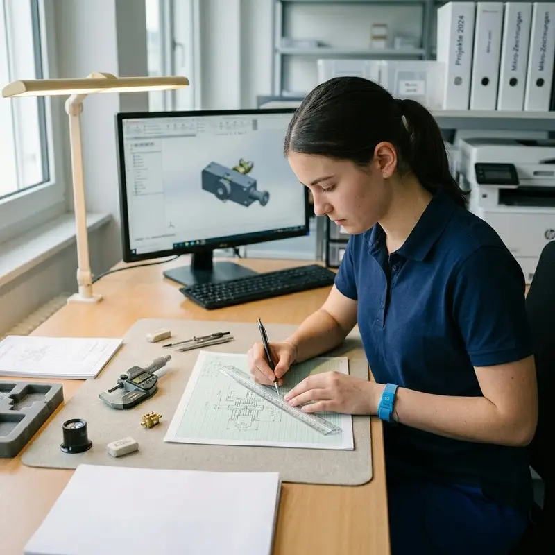 "description": "Du zeichnest mit Feinminenstift und Lineal eine präzise Skizze eines Kleinteils auf Millimeterpapier im Büro.",
