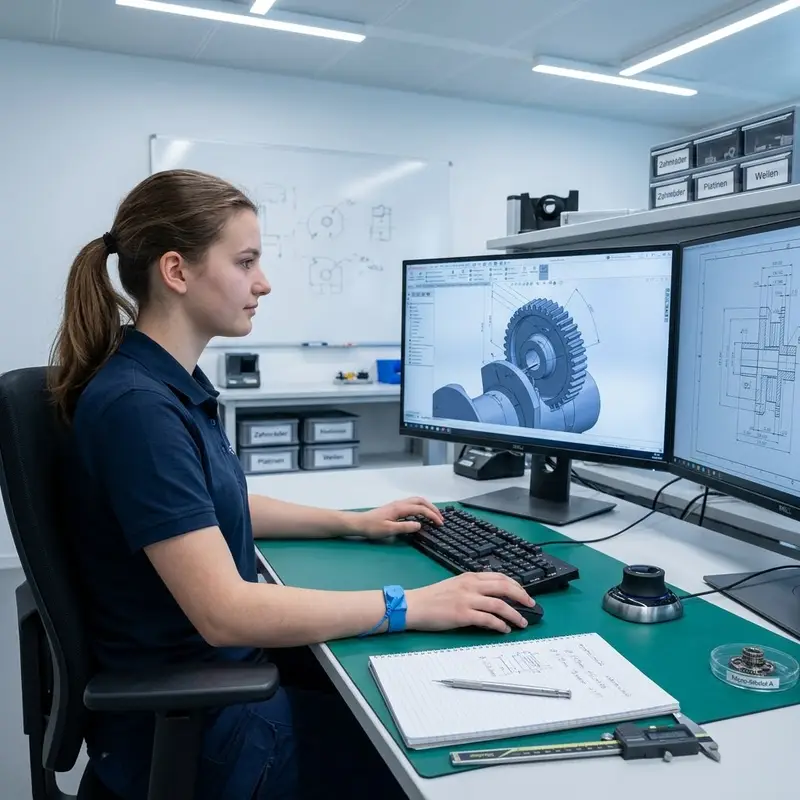 "description": "Du konstruierst am Computer mit CAD-Software ein 3D-Modell und eine technische Zeichnung für ein Mikrobauteil im Konstruktionsraum.",