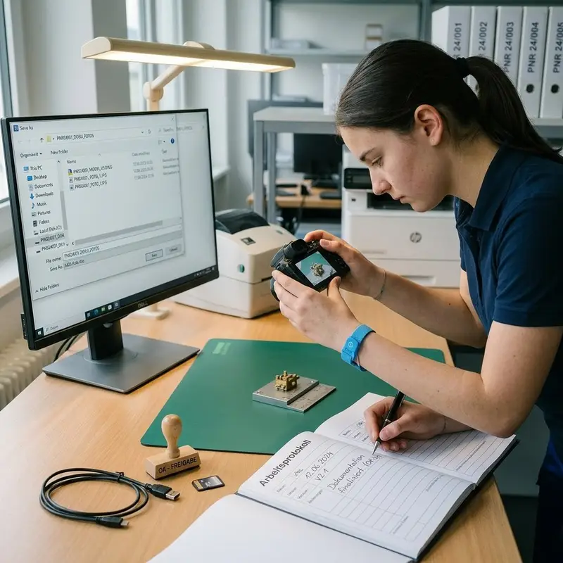 "description": "Du fotografierst dein fertiges Modell, speicherst die Datei und trägst Änderungen in ein Arbeitsprotokoll am Arbeitsplatz ein.",