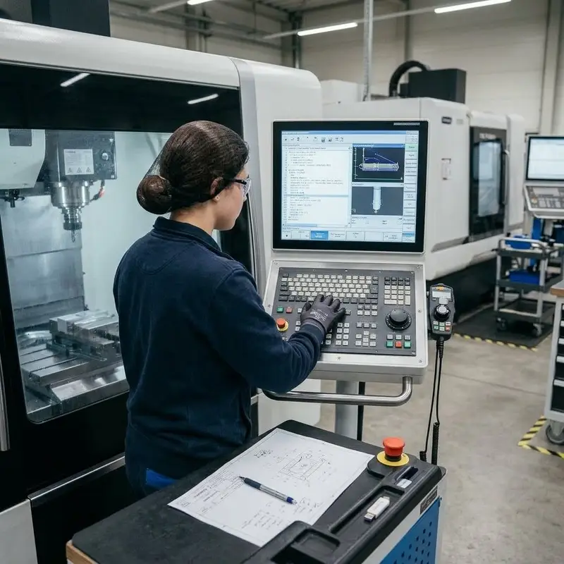 "description": "Du programmierst am Steuerpult die Bearbeitungsschritte und startest den Probelauf an der Maschine.",
