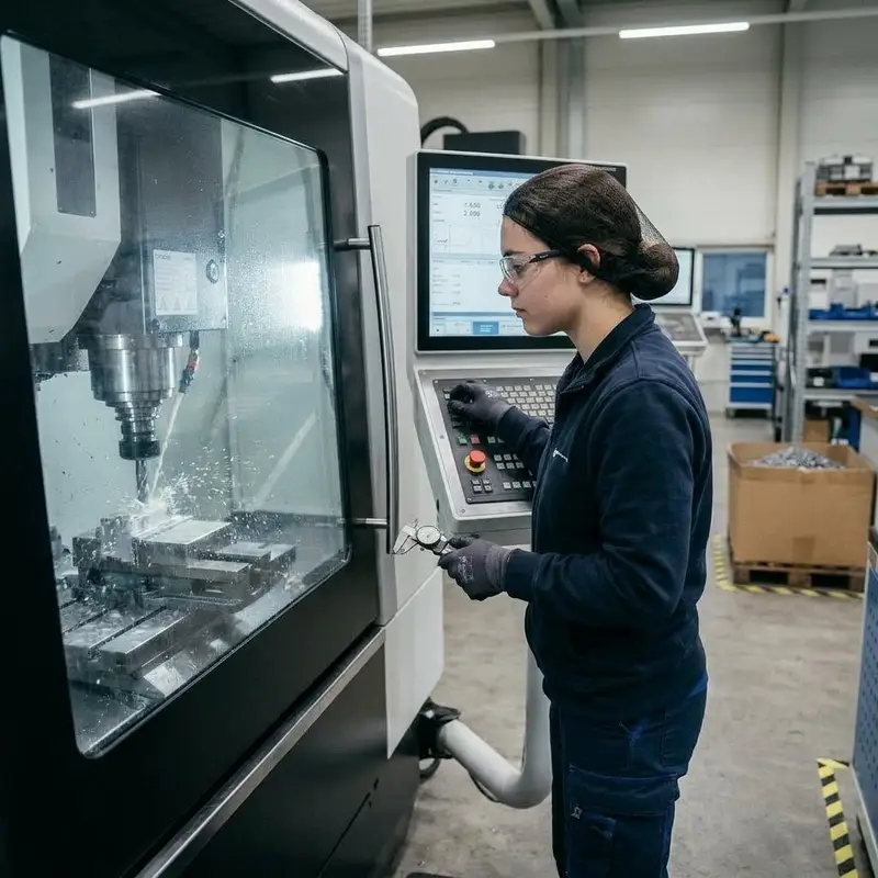 "description": "Du bohrst, drehst oder fräst ein Metallteil an der laufenden Maschine und überwachst dabei den Prozess.",
