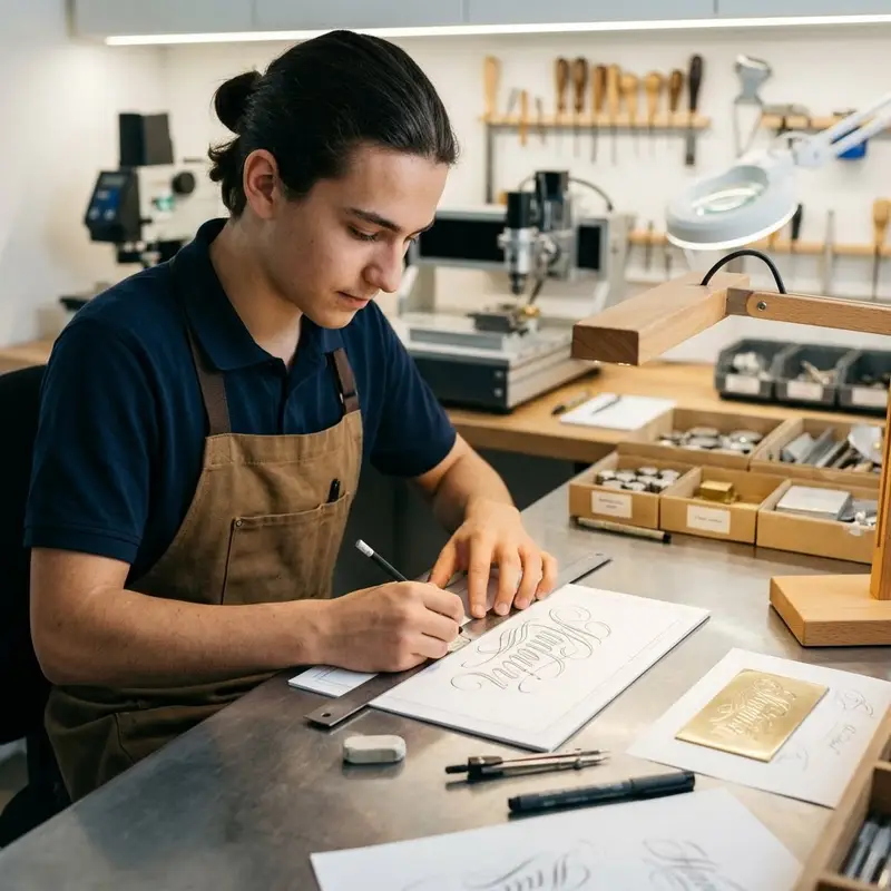 "description": "Du entwirfst am Arbeitstisch in der Werkstatt ein Motiv oder einen Schriftzug auf Papier mit Bleistift und Lineal.",