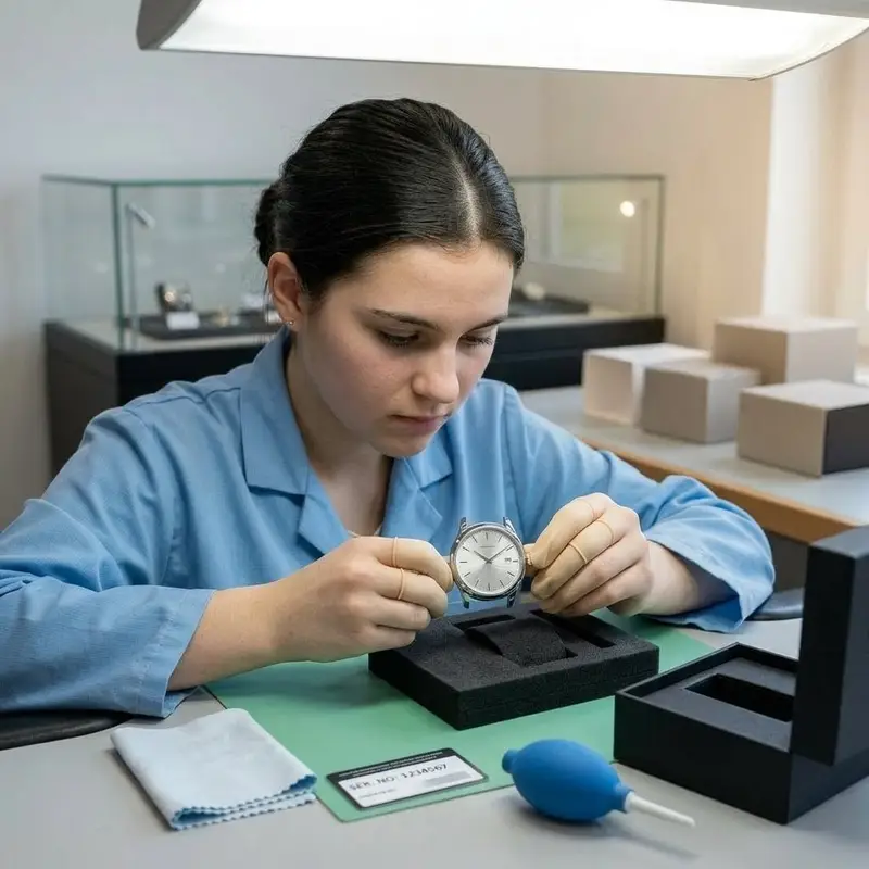 "description": "Du stellst an der Krone Zeit und Datum ein und bereitest die fertige Uhr auf dem Ablagetablett für die Auslieferung vor.",