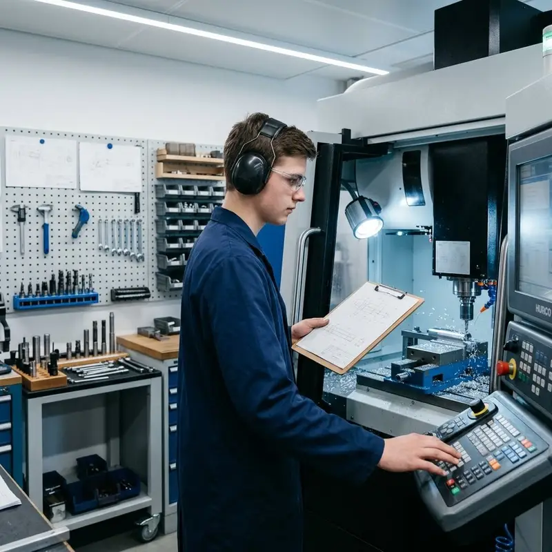 "description": "Du fräst und bohrst in der Werkstatt Metallteile für eine Waffe an der Maschine nach Zeichnung.",