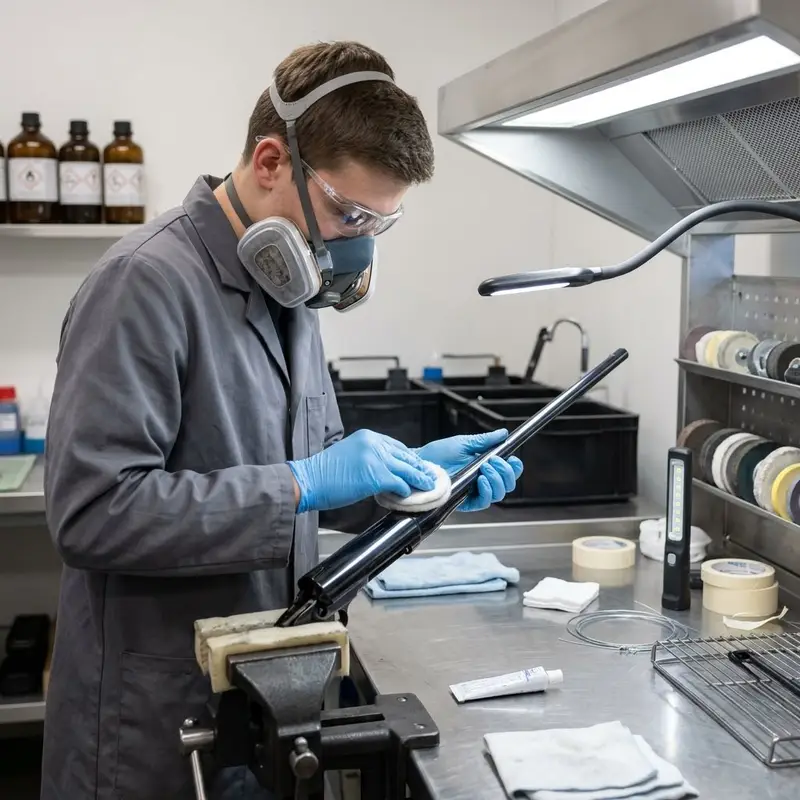 "description": "Du brünierst oder lackierst die Metalloberfläche und polierst die Waffe im Finish-Bereich.",