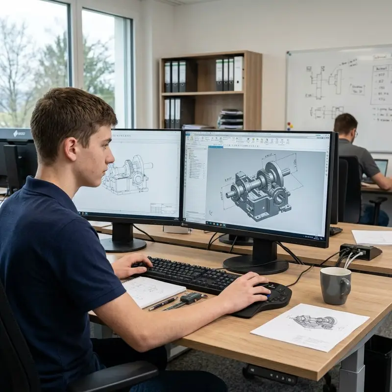 "description": "Du konstruierst am Computer mit CAD-Software ein 3D-Modell einer Maschine im Büro.",