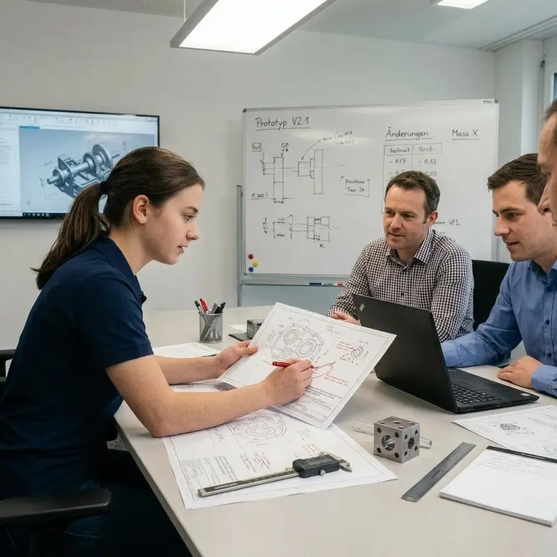 "description": "Du besprichst am Tisch mit Ingenieuren und Technikern einen Prototypenplan und markierst Änderungen auf dem Ausdruck.",