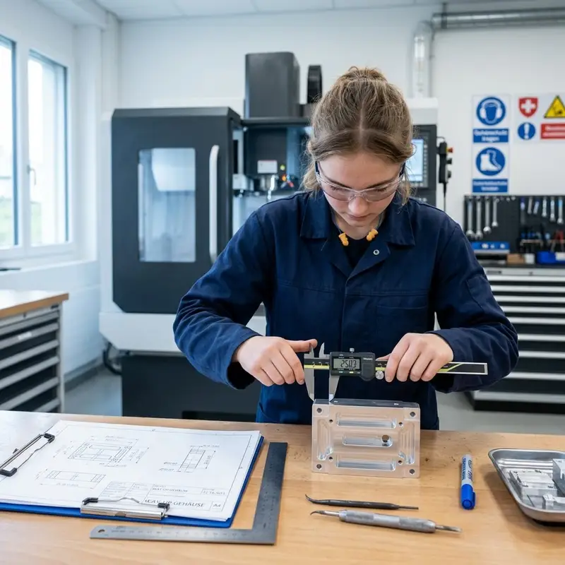 "description": "Du kontrollierst in der Werkstatt ein gefertigtes Bauteil mit Messschieber und vergleichst es mit der Zeichnung.",