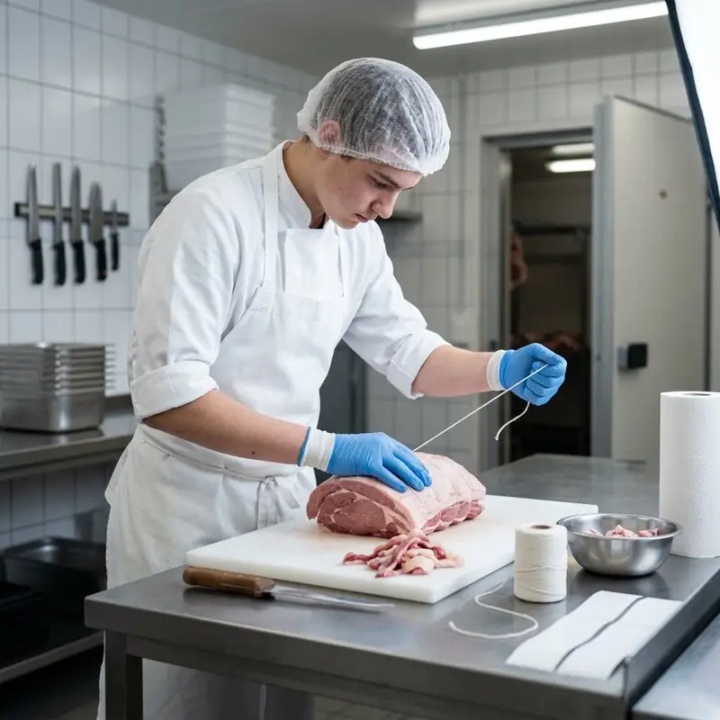 "description": "Du entfernst Sehnen und überschüssiges Fett und bindest das Fleisch mit Küchengarn in Form auf dem Arbeitstisch.",