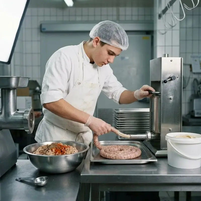 "description": "Du zerkleinerst Fleisch im Wolf, mischst es mit Gewürzen und füllst die Masse an der Wurstfüllmaschine in Därme.",