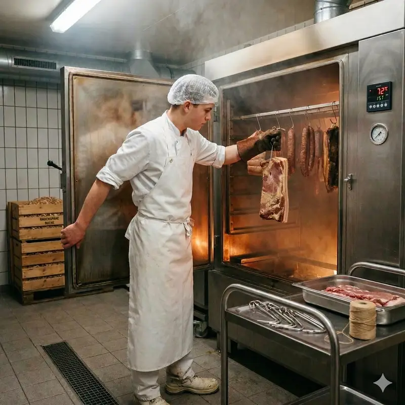 "description": "Du hängst vorbereitete Fleischstücke in den Räucherofen und kontrollierst Rauch und Temperatur während des Räucherns.",