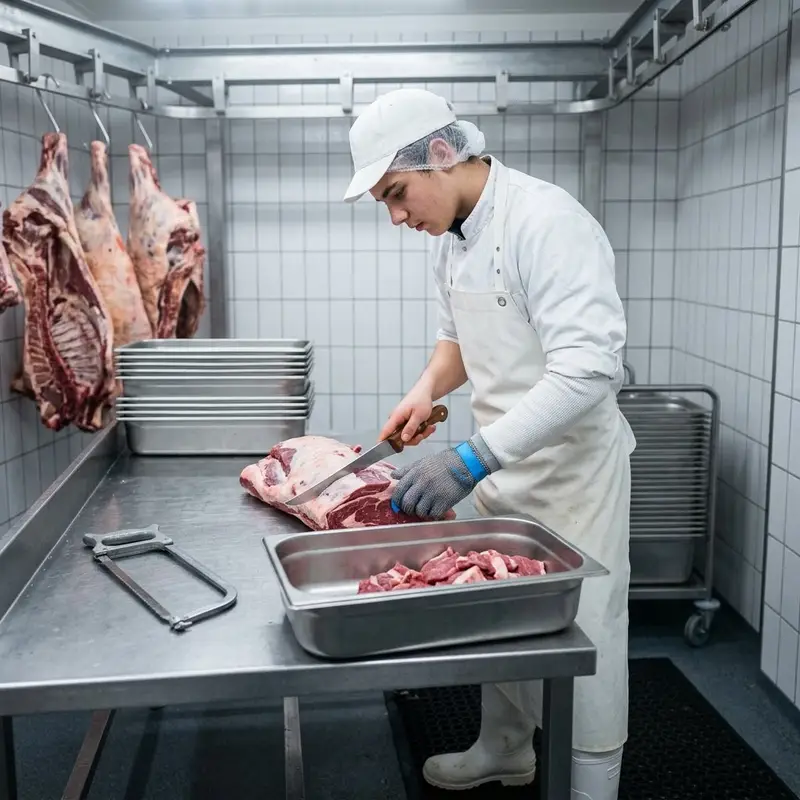 "description": "Du zerlegst im Kühlraum einen Tierkörper mit Messer und Säge in einzelne Fleischstücke und legst sie in Edelstahlwannen.",
