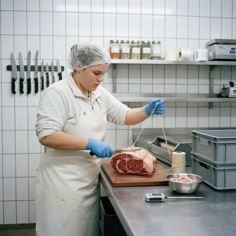 "description": "Du bindest an der Werkbank mit Küchengarn einen Braten in Form und schneidest überstehendes Fett mit dem Messer weg.",