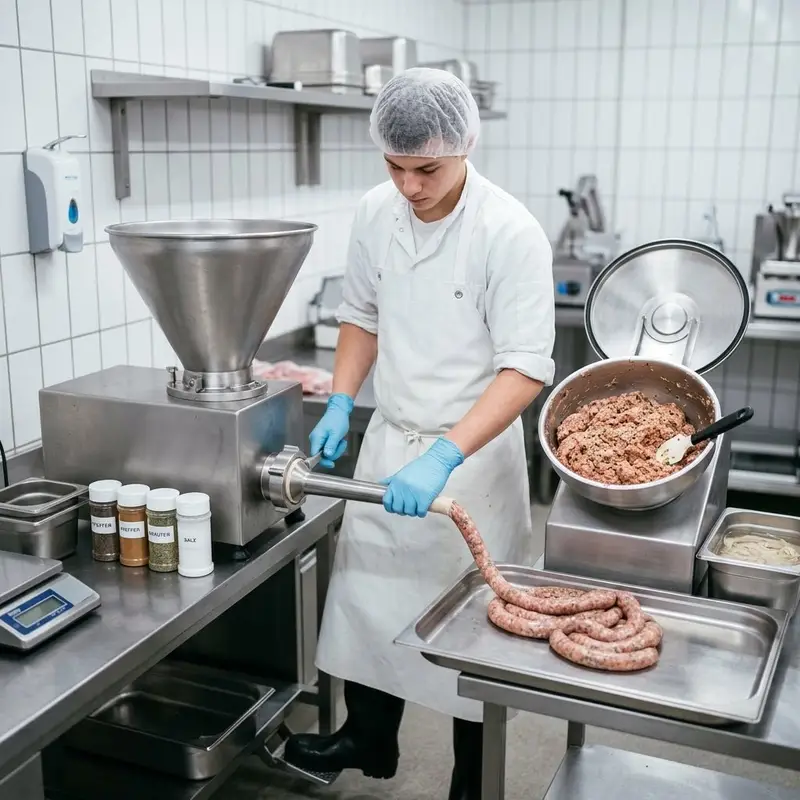 "description": "Du mischst im Kutter Hackfleisch mit Gewürzen und füllst die Masse mit der Wurstfüllmaschine in Därme.",
