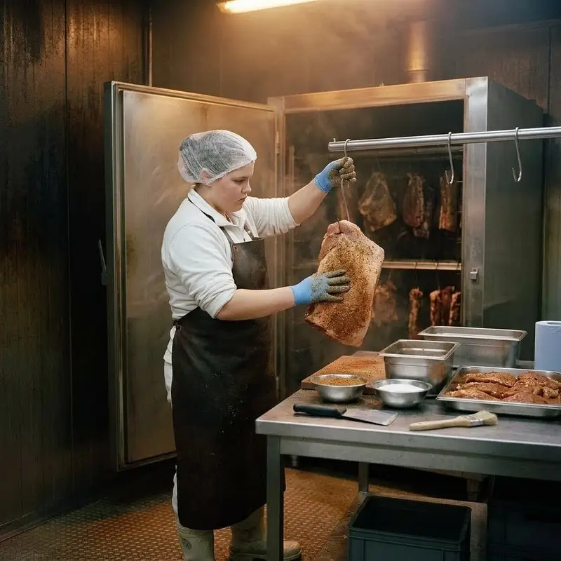 "description": "Du reibst Fleischstücke mit einer Gewürzmischung ein und hängst sie im Räucherofen an Haken zum Räuchern auf.",