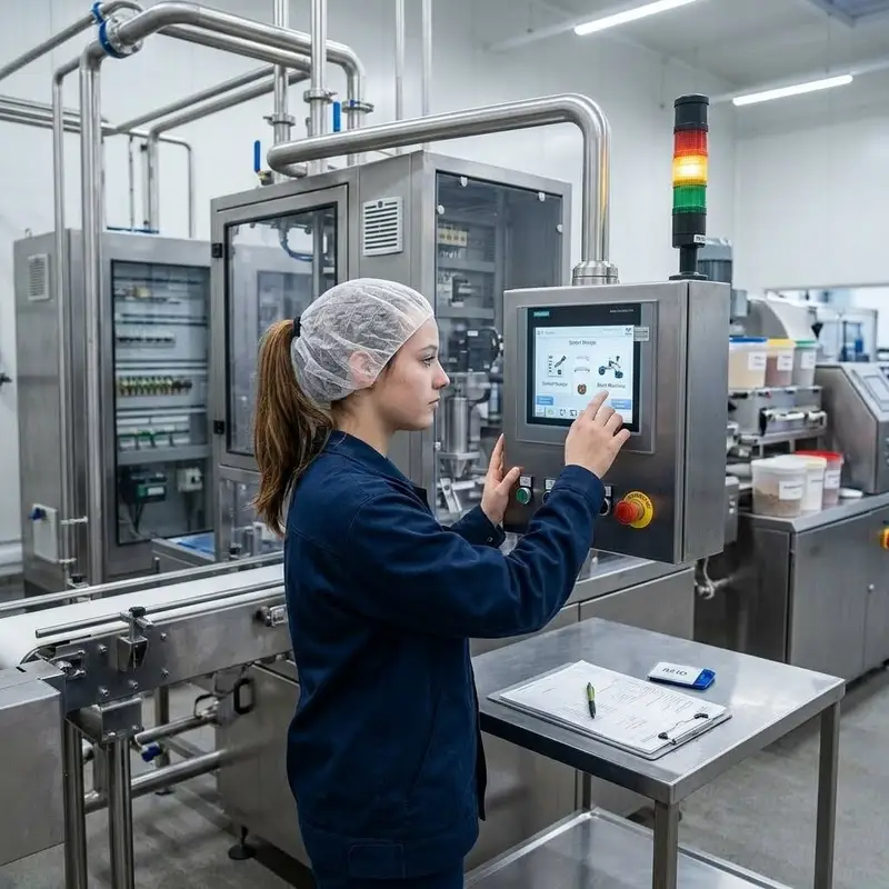 "description": "Du richtest an der Produktionslinie die computergesteuerte Anlage ein, wählst das Rezept am Bedienpanel und startest die Maschine.",