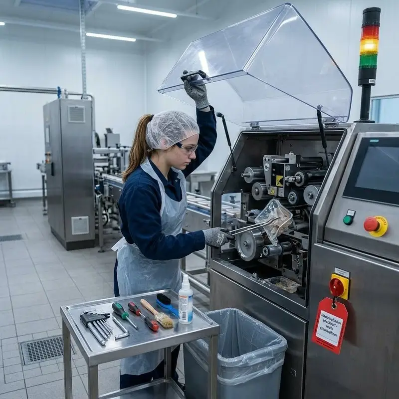 "description": "Du stoppst die Linie bei einer Störung, öffnest Schutzabdeckungen, entfernst verklemmtes Material und stellst die Maschine wieder ein.",