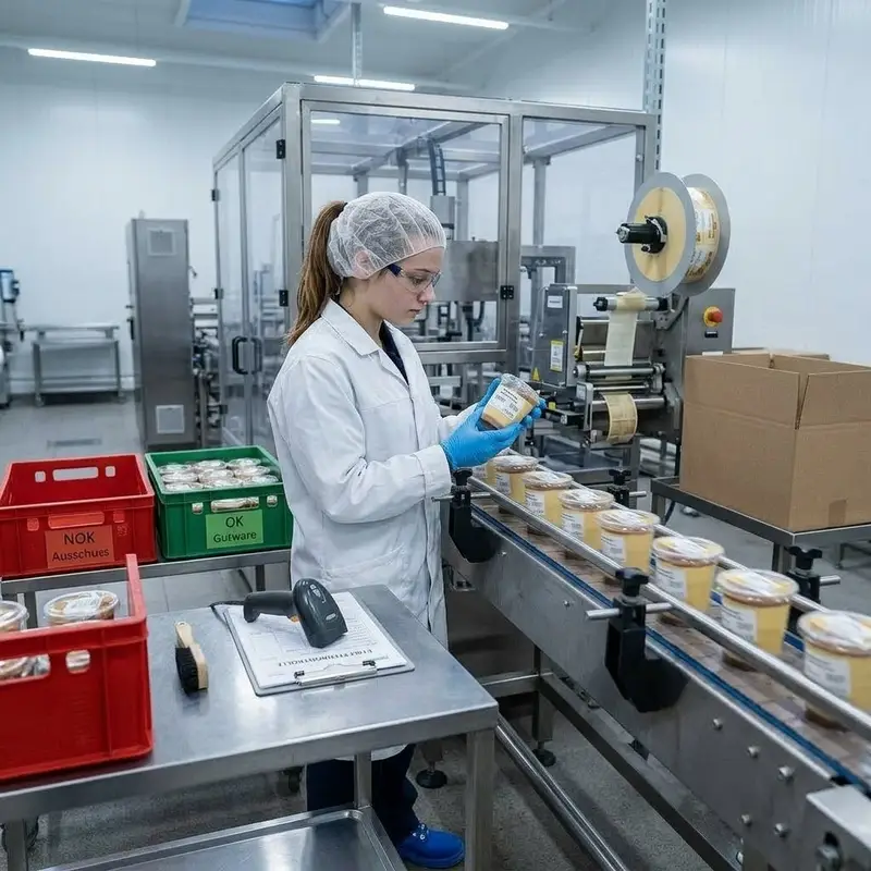 "description": "Du füllst das fertige Produkt in Becher, Flaschen oder Beutel ab, verschliesst die Packungen und kontrollierst die Etiketten am Auslauf der Linie.",