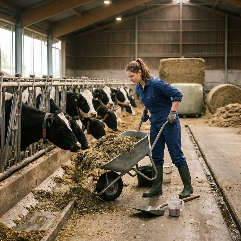 "description": "Du füllst im Stall Futter und Wasser in Tröge und verteilst Heu oder Silage an die Tiere.",