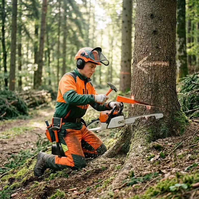 "description": "Du sägst einen Baum mit der Motorsäge an und treibst Fällkeile in den Schnitt, damit der Stamm kontrolliert in die gewünschte Richtung fällt.",