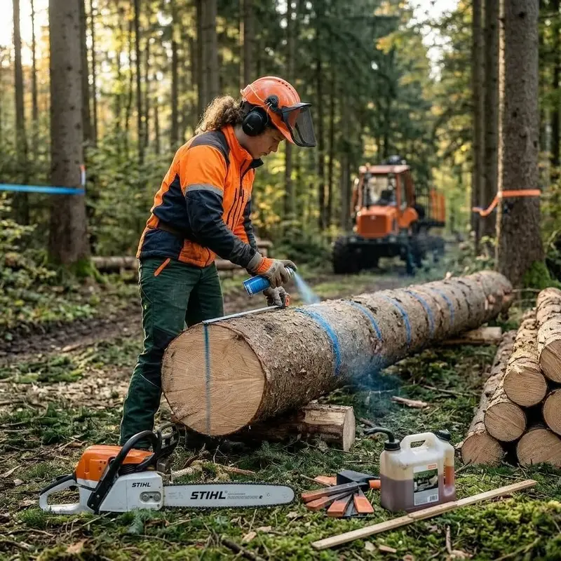 "description": "Du misst einen Stamm mit Messband und Markierspray ab und schneidest ihn vor Ort in transportfähige Stücke.",