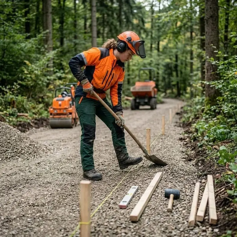 "description": "Du schaufelst und verdichtest Kies auf einem Waldweg und setzt mit Wasserwaage und Holzpflöcken die Wegkante.",