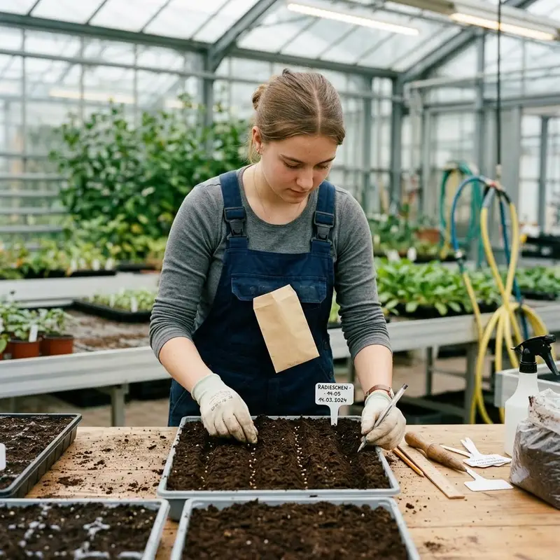 "description": "Du säst Gemüsesamen in Saatschalen im Gewächshaus und beschriftest die Reihen.",